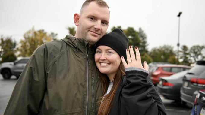 "I had no idea; I was wearing this," a laughing Dorrin said, pointing to her comfortable getup. "I had absolutely no clue until he actually got down on one knee."