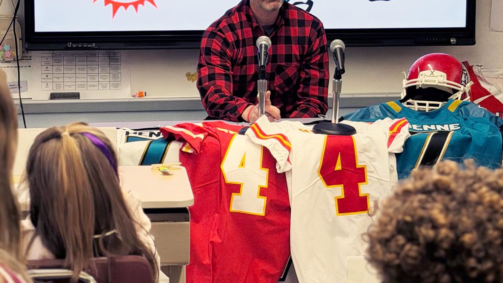 As part of the activity, Mattiuz transformed her classroom into a mock press conference. Each student prepared and asked Henne two interview questions, engaging directly with him about his collegiate and professional football career. The experience gave students the opportunity to practice communication skills, build confidence, and interact with an authentic community stakeholder.