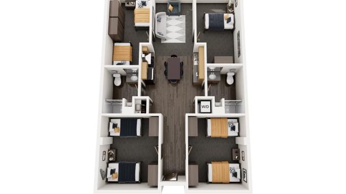 Shared Efficiency SuiteApproximate Size: 604 square feet (📷: See a larger rendering.) 2025-2026• Per Year: $11,350 • Per Semester: $5,675 | 3 Shared Room, |